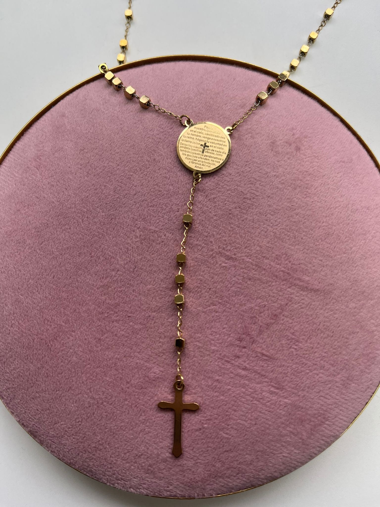 Medalla religiosa de acero inoxidable con acabado dorado que presenta la oración del Padre Nuestro grabada en su superficie. Diseñada con precisión para perdurar en el tiempo, combina durabilidad y elegancia espiritual. Su material resistente a la corrosión garantiza que mantenga su brillo dorado sin necesidad de mantenimiento constante. Pieza versátil que funciona como colgante devocional o elemento de joyería religiosa para colecciones personales. Ideal para regalos significativos o como accesorio de fe cotidiano.