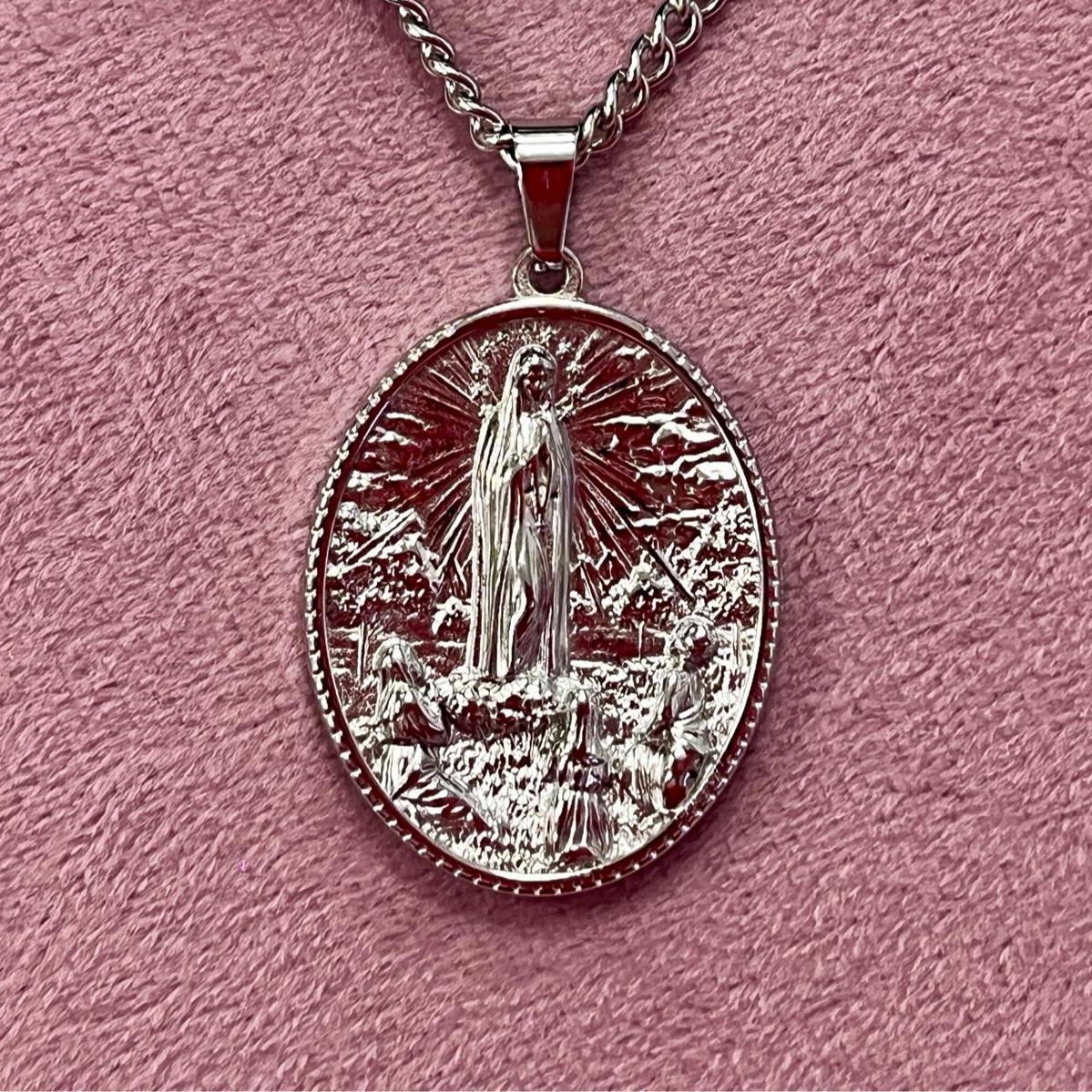Medallón Virgen de Fátima - Escena Detallada y Cadena de Acero Inoxidable Resistente al Agua