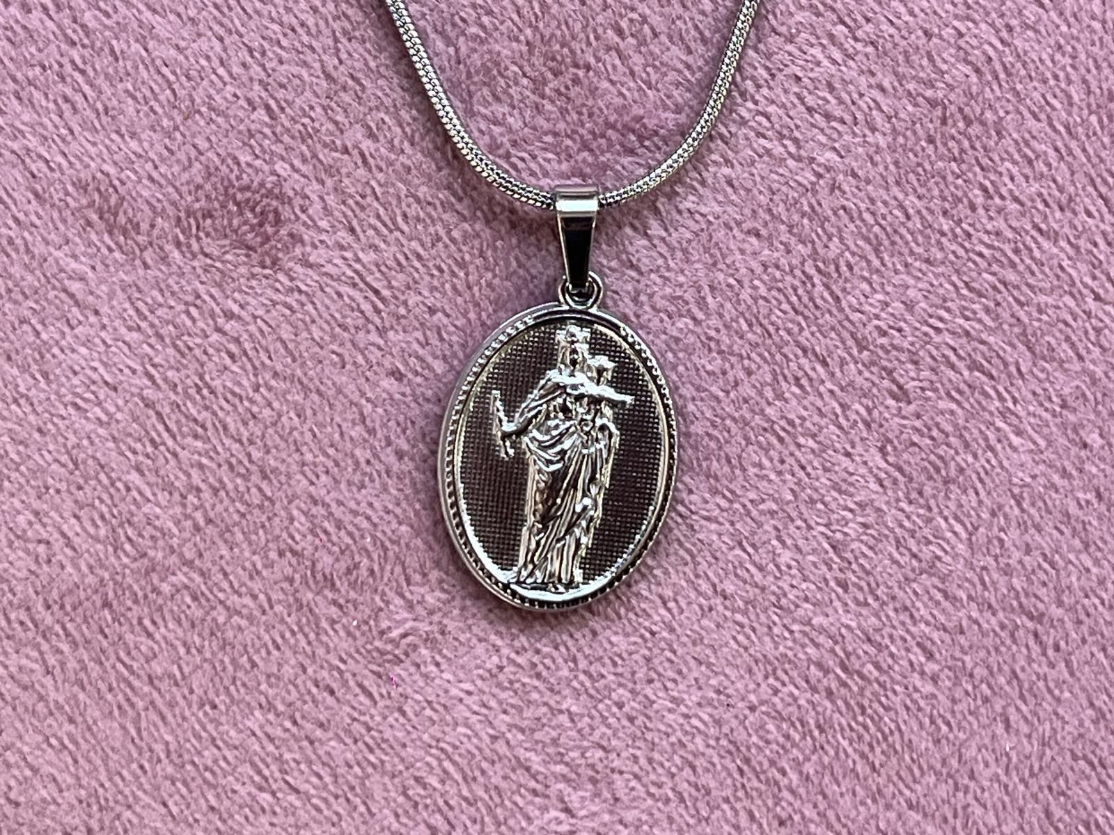 Medalla devocional de acero inoxidable que representa a la Virgen María Auxiliadora, patrona de los jóvenes. Elaborada con materiales de alta durabilidad, resiste el paso del tiempo sin oxidación ni decoloración. Incluye cadena dorada que complementa el diseño clásico y elegante de la pieza. Ideal para quienes buscan una joya religiosa de calidad que combine tradición espiritual con acabados contemporáneos. Perfecta como regalo significativo o para uso personal diario.