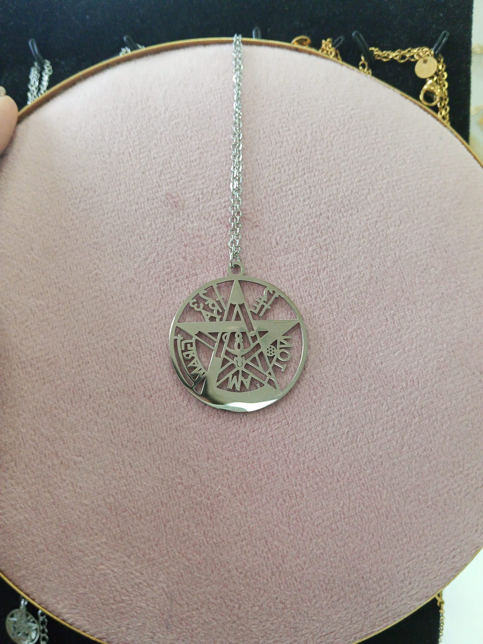 Medallón Tetragramatrón en acero inoxidable con acabado plateado de alta calidad. Este colgante presenta el símbolo sagrado del Tetragramatrón, grabado con precisión en una pieza duradera y resistente a la corrosión. Ideal para quienes buscan una joya con significado espiritual y estético. El acero inoxidable garantiza longevidad y mantenimiento mínimo, permitiendo que el medallón conserve su brillo plateado a lo largo del tiempo. Una pieza versátil que combina artesanía con simbolismo ancestral.