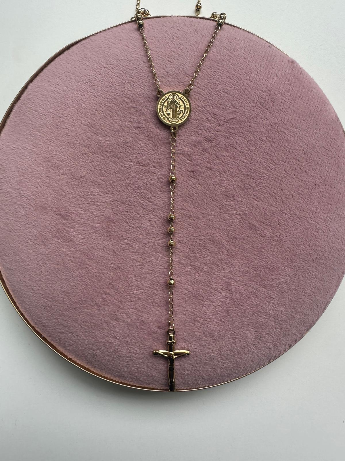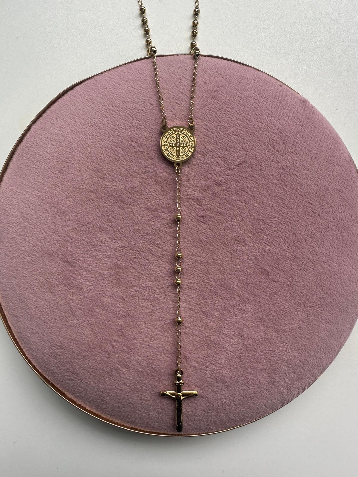 Rosario de acero inoxidable con medalla de San Benito dorada, diseñado para perdurar. Cada cuenta está pulida con precisión, garantizando un acabado impecable y resistencia a la corrosión. La medalla central presenta los símbolos tradicionales de protección de San Benito, grabados con claridad. Ideal para devoción diaria o como pieza de colección. El acero inoxidable mantiene su brillo sin necesidad de mantenimiento constante, mientras que el dorado aporta elegancia atemporal. Una joya funcional que combina espiritualidad y durabilidad.